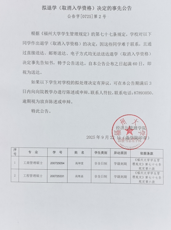 关于20级专业学位硕士高坤堂、高寒垚等两位同学拟退学决定的事先公告